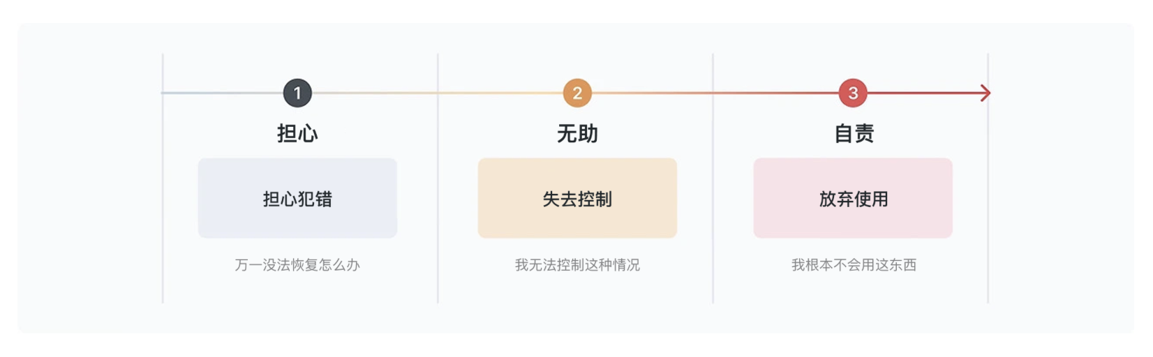 而不管是哪種錯誤,都會觸發(fā)用戶的負面情緒:擔(dān)心 “刪錯的文件找不回來”(恐懼)、覺得 “我怎么連這個都不會用”(自責(zé))、面對錯誤提示不知道下一步該做(無助)。最可怕的是 “自責(zé)”—— 當(dāng)用戶把錯誤歸咎于自己,壓力會越來越大,最后干脆關(guān)掉 APP,再也不回來。