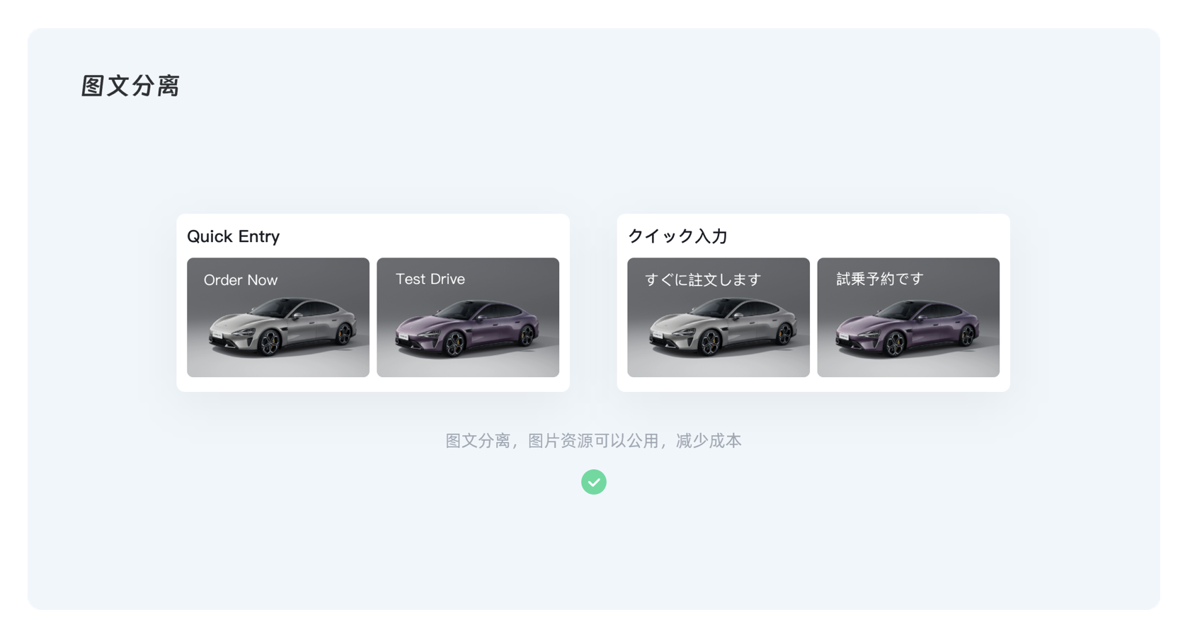 - 別在圖片里嵌文本:若圖片含 “立即下單”,每種語言需做一張圖,增加開發(fā)成本與 APP 體積;