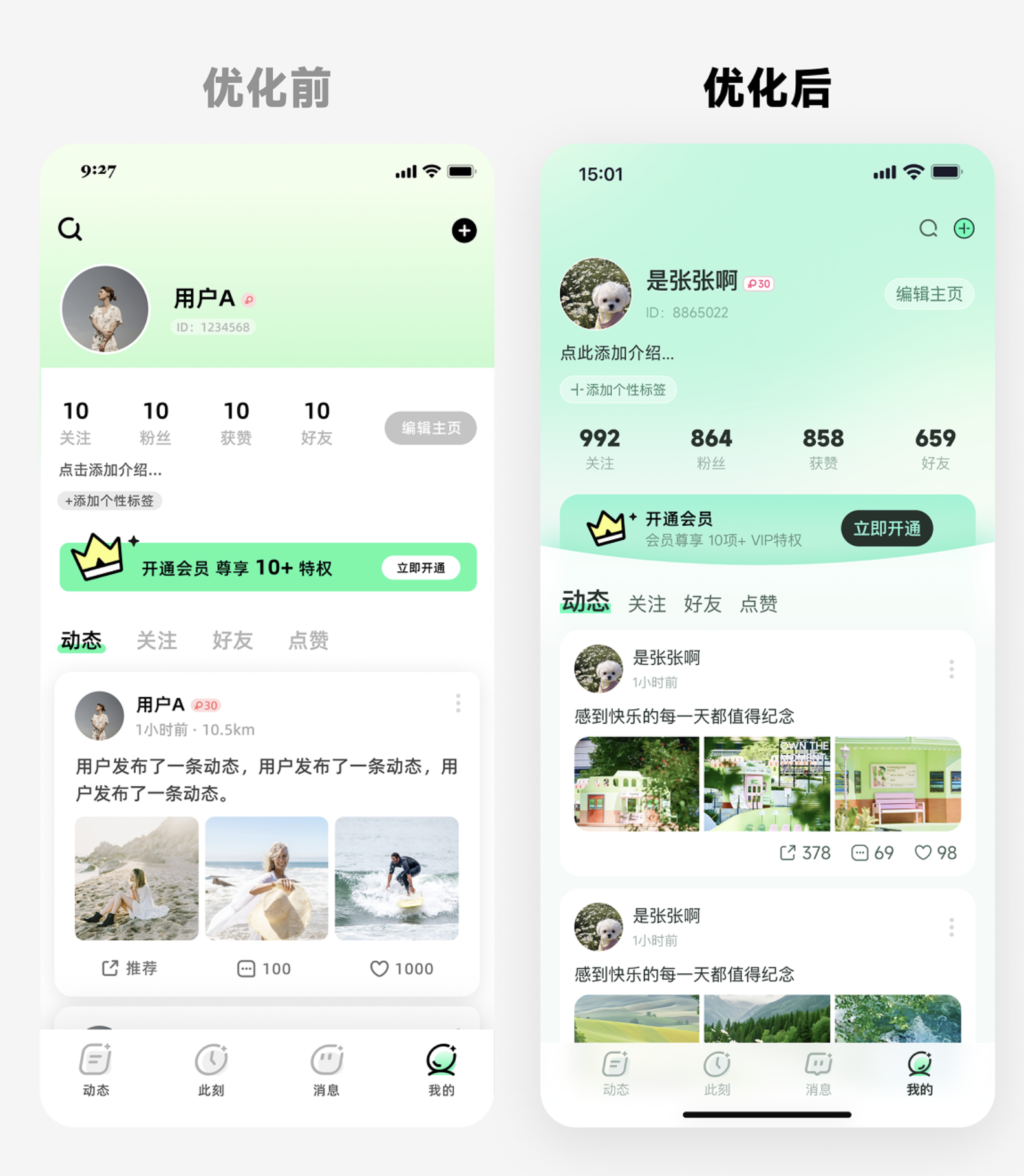 - 輕分割:用淺灰色背景分割不同的動(dòng)態(tài)卡片,替代之前厚重的投影 —— 既區(qū)分了模塊,又不會(huì)讓頁(yè)面顯得 “笨重”;