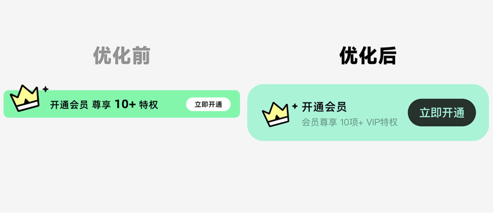之前的 “開通會(huì)員” 入口,就一句話 “開通會(huì)員 尊享 10 + 特權(quán)” 加個(gè)小按鈕,平平無奇。優(yōu)化時(shí)我們分了三步 “造層次”: