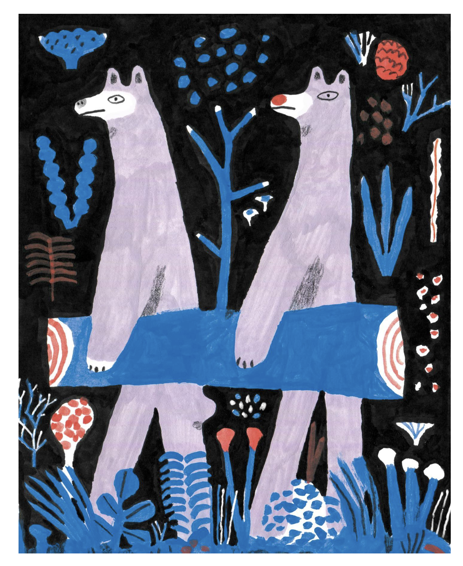 Andrea 的畫,第一眼就帶著 “不刻意的可愛”。他從不用規整的線條框定形象,反倒偏愛孩童般的 “稚拙感”:歪歪扭扭的動物輪廓、不對稱的眼睛、翹得老高的嘴角,連植物的枝葉都像剛被風吹得晃了晃 —— 比如那只圓滾滾的小熊,頂著歪歪的條紋帽子,爪子搭在蜂蜜罐上,明明線條簡單到像隨手畫的草稿,卻讓人一眼就被它的憨態逗笑。這種 “反精致” 的風格,恰恰打破了成人世界對 “完美” 的執念,就像小時候我們趴在桌上涂畫時,從不在意線條是否筆直,只在乎筆下的角色是否 “有趣”。
