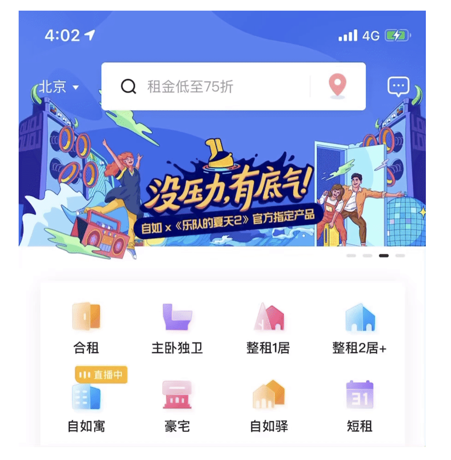 通欄 Banner 是首屏的 “常客”—— 它占據(jù)整個頁面寬度,視覺沖擊力強(qiáng),適合傳遞單一、重要的信息,比如產(chǎn)品的年度活動、核心功能更新。以自如的首頁 Banner 為例,通欄設(shè)計搭配 “租金低至 75 折” 的大標(biāo)題,配合分層視覺效果,瞬間抓住用戶對 “優(yōu)惠” 的注意力;再如工具類 APP 的 “版本更新” Banner,通欄布局讓 “立即升級” 的入口更突出,降低用戶操作成本。