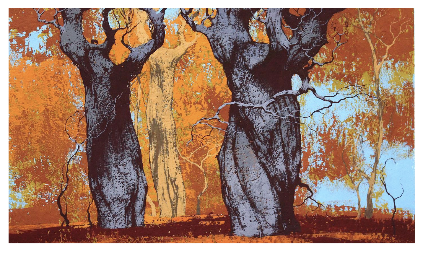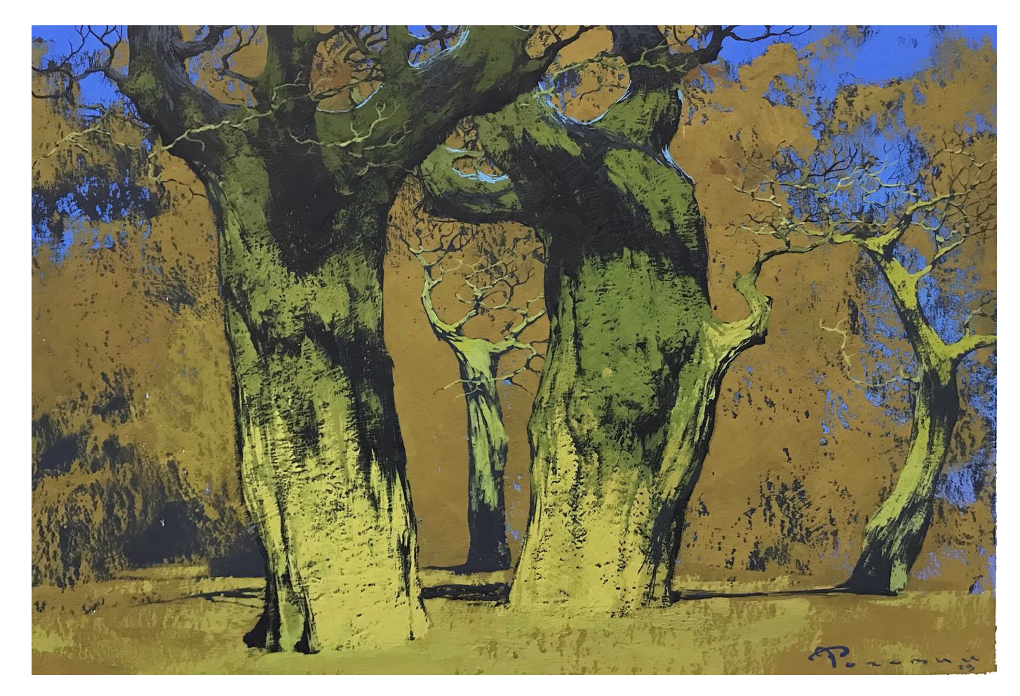- 配色的矛盾與和諧:藍紫色的冷、晚霞的暖、枯樹的褐,這些看似沖突的色彩在他的畫布上完美融合。這種 “怪異卻合理” 的配色邏輯,讓每一幅作品都自帶辨識度,既保留了冬日的清冷基調(diào),又注入了浪漫的溫度。