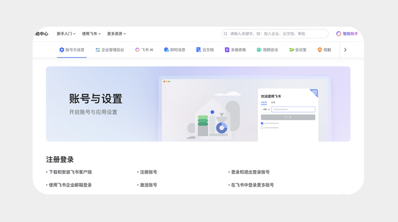 在標(biāo)簽欄兩側(cè)添加左右箭頭,點(diǎn)擊即可展示更多標(biāo)簽,適合功能模塊較多的 B 端產(chǎn)品或網(wǎng)頁。比如飛書的幫助中心頁面,標(biāo)簽頁涵蓋 “智能助手”“云文檔”“視頻會議” 等多個功能,通過左右箭頭切換,既保證界面整潔,又能完整呈現(xiàn)所有選項,不影響用戶操作流程。