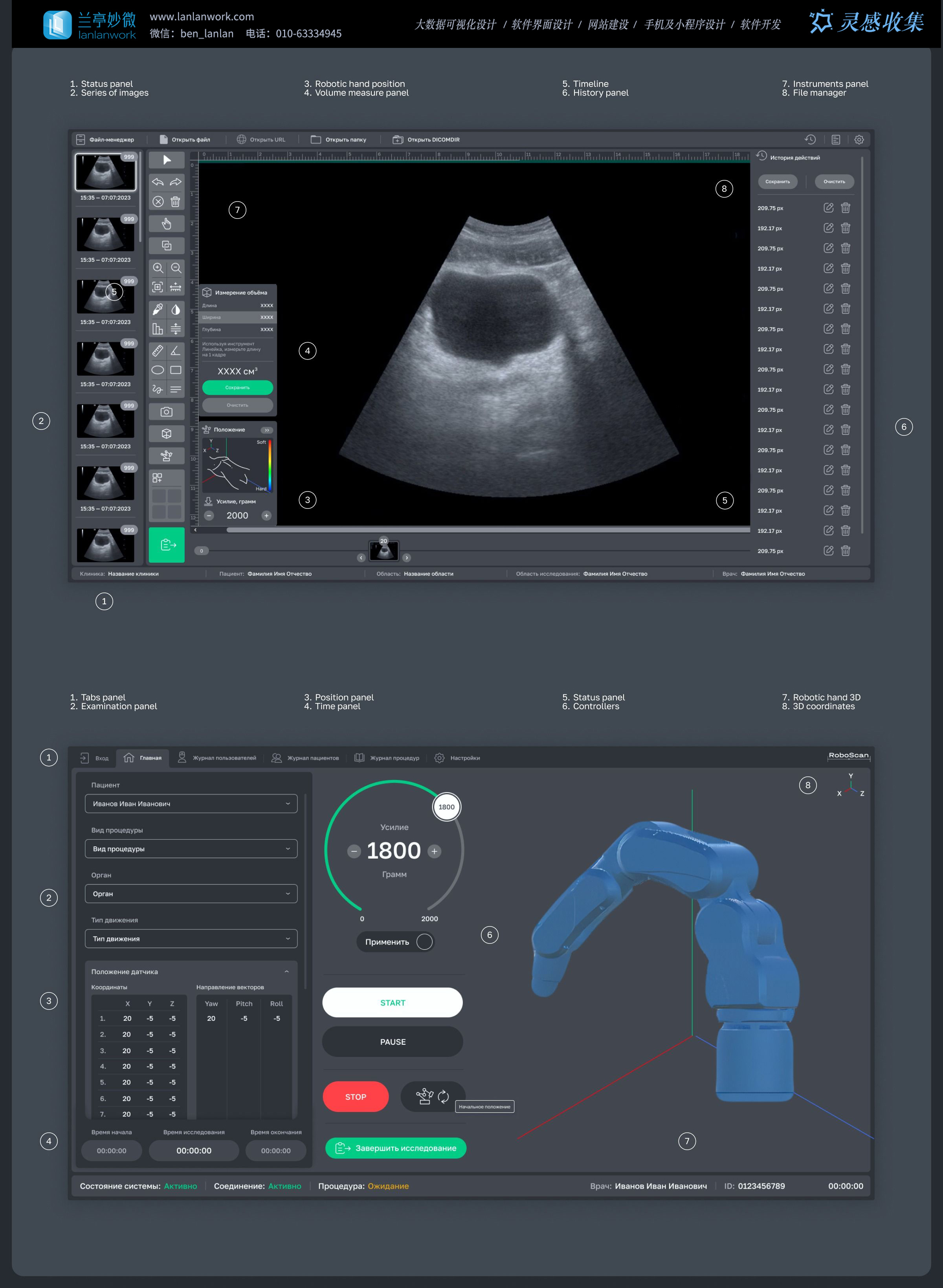 當醫療機器人界面還停留在 “設備控制 + 數據展示” 的分離邏輯時,蘭亭妙微這套超聲機器人系統界面,以「影像 - 操作雙維協同」的設計思路,重構了 “醫生 - 機器人 - 患者” 的交互關系。它不僅是一個操作面板,更是醫療機器人領域 “精準性與易用性平衡” 的標桿案例。