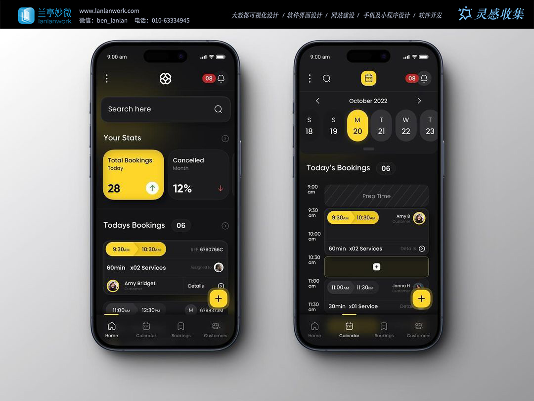 當服務類預約 App 還困在 “淺白雜亂” 與 “功能冗余” 的窠臼中時,蘭亭妙微這款暗黑系預約管理工具,用「高對比信息層」與「場景化功能閉環」,把服務商家的 “接單、排期、統計” 需求壓縮成移動端的 “一鍵操作流”。這不僅是一個界面,更是服務從業者 “輕量化管店” 的效率武器。