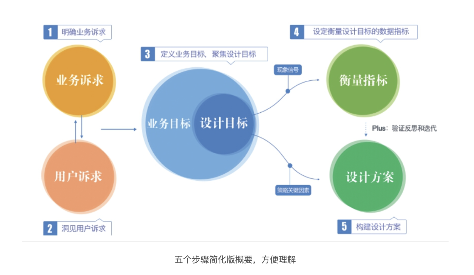 首先是明確業務訴求,需理清市場劃分、核心價值、收入模型與落地策略,避免設計偏離業務方向;其次是洞見用戶訴求,通過 STAR 場景故事法挖掘用戶當前及潛在需求,而非停留在表面反饋;接著是定義聚焦設計目標,遵循 SMART 原則讓目標更具體可落地;隨后是設定衡量指標,借助 VSM 模型、HEART 模型讓設計效果可量化;核心環節是構建設計方案,融合創意與審美實現功能與體驗的統一;最后是驗證迭代,通過數據反饋形成優化閉環。