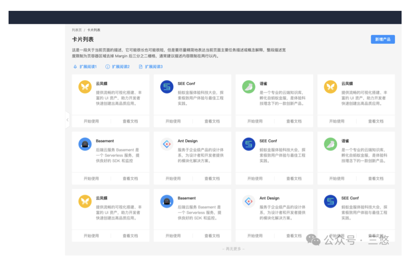 - 每個(gè)卡片包含明確的標(biāo)題、簡(jiǎn)要描述、核心功能按鈕(如 “開(kāi)始使用”“查看文檔”),信息層級(jí)清晰;