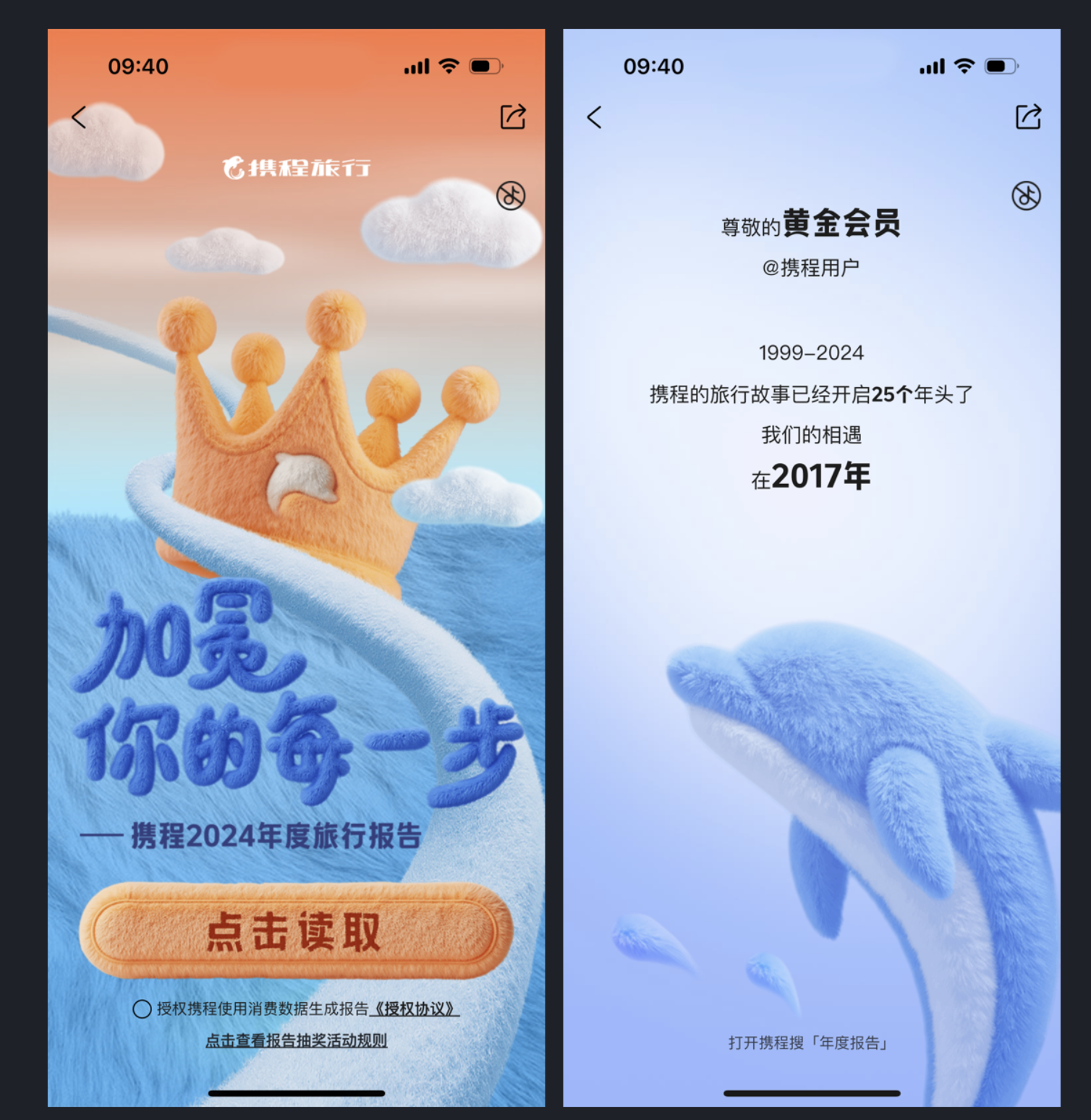 年度報告已成為產品與用戶情感連接的重要載體,而獨特的設計風格能讓這份連接更具溫度。攜程旅行 2024 年度旅行報告以毛茸茸的設計語言貫穿始終,從圖標、字體到背景、按鈕,每一處細節都透著柔軟細膩的質感,在寒冬時節給用戶帶來別樣溫暖。報告不僅呈現了用戶 8 年探訪 15 座城市、足跡 5 萬公里的硬核數據,更通過 "加冕你的每一步" 的情感化文案,搭配勛章體系和互動抽獎,讓用戶在回顧旅行的過程中獲得成就感與歸屬感。這種將數據可視化與情感化設計結合的方式,讓年度報告不再是冰冷的數據羅列,而是充滿記憶點的情感體驗。