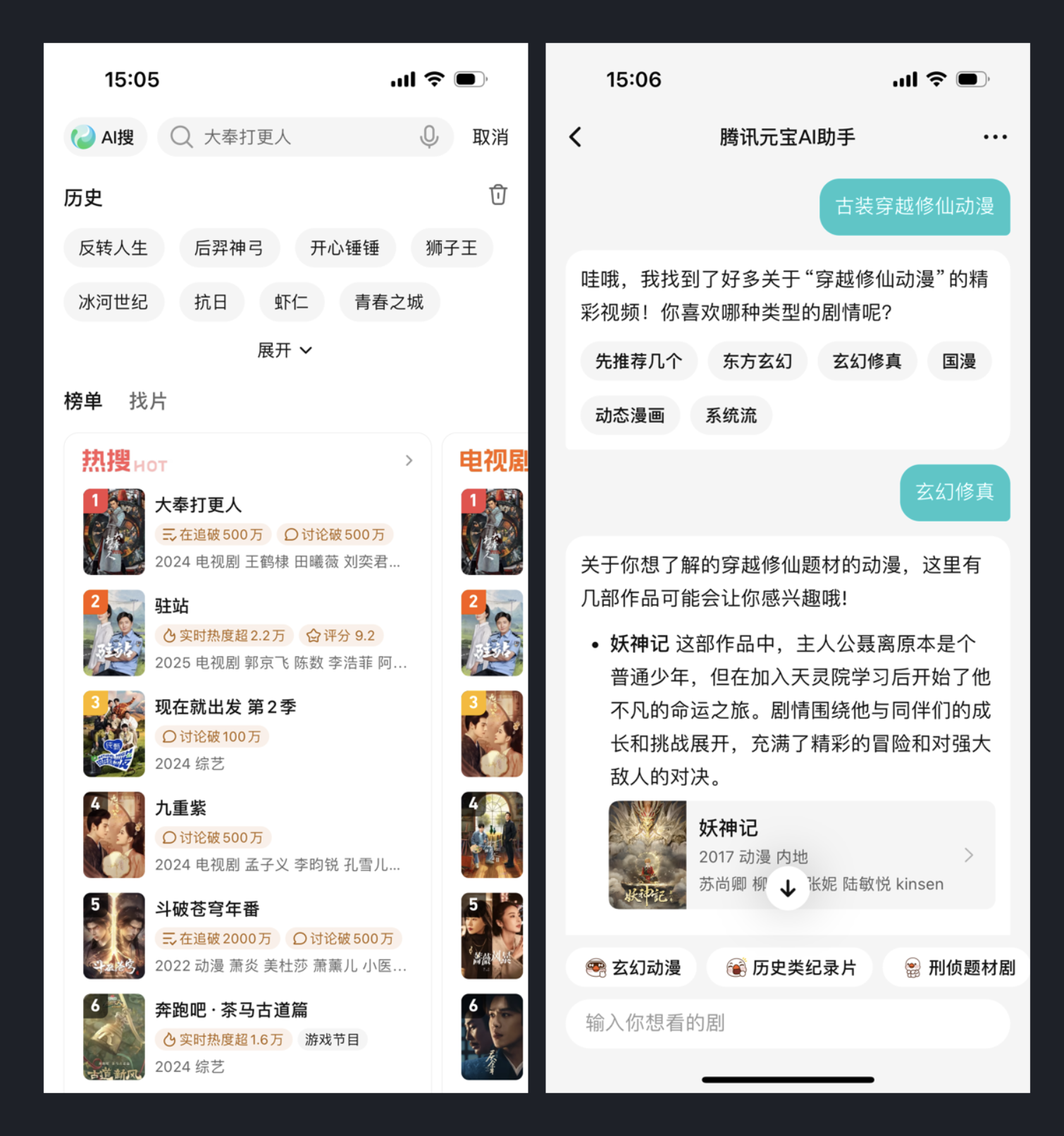 AI 技術的發展為產品體驗升級提供了無限可能,騰訊視頻 App 的 AI 搜索功能便是典型案例。區別于傳統關鍵詞搜索,用戶可通過騰訊元寶 AI 助手以對話形式查找影片,無論是精準定位某部作品,還是描述模糊的題材偏好,AI 都能快速響應并推薦相關內容。例如搜索 "穿越修仙動漫",助手會主動分類推薦《妖神記》等作品,并簡要介紹劇情亮點,讓搜索過程更具互動性與針對性。這種 AI 賦能的搜索方式,不僅降低了用戶的操作成本,更讓信息獲取過程變得輕松愉悅,重新定義了視頻平臺的搜索體驗。