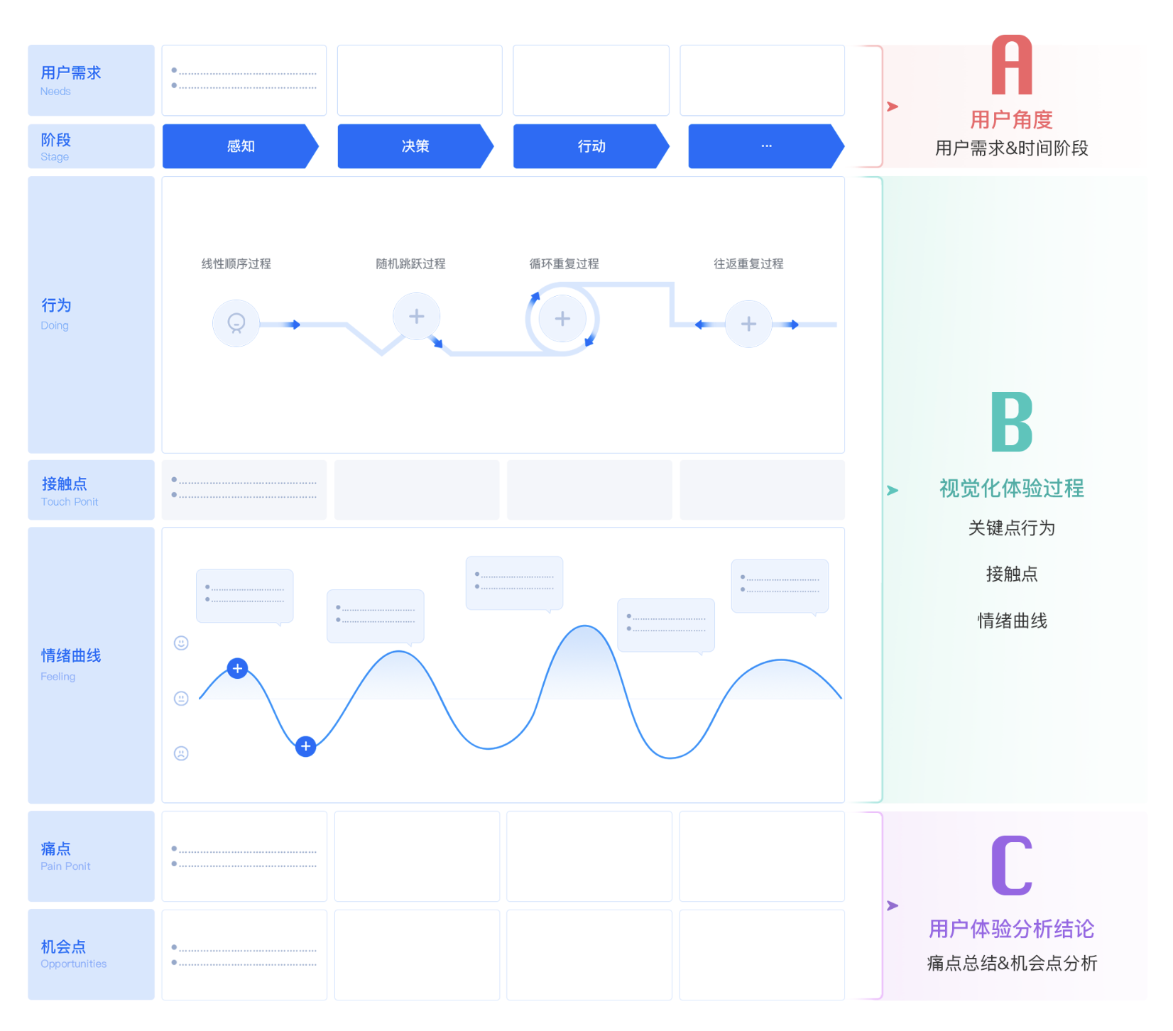 - 達(dá)成共識,降低溝通成本:通過可視化的地圖呈現(xiàn)痛點(diǎn)與機(jī)會點(diǎn),讓產(chǎn)品、設(shè)計、運(yùn)營、開發(fā)團(tuán)隊(duì)對優(yōu)化方向形成統(tǒng)一認(rèn)知,避免主觀判斷帶來的分歧,讓工作更有針對性。