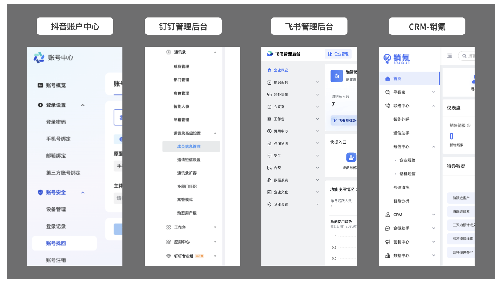 適用場景:高頻操作多、需要全局搜索 / 消息提醒的中大型 B 端產(chǎn)品,如飛書后臺、釘釘管理后臺、抖音電商羅盤。