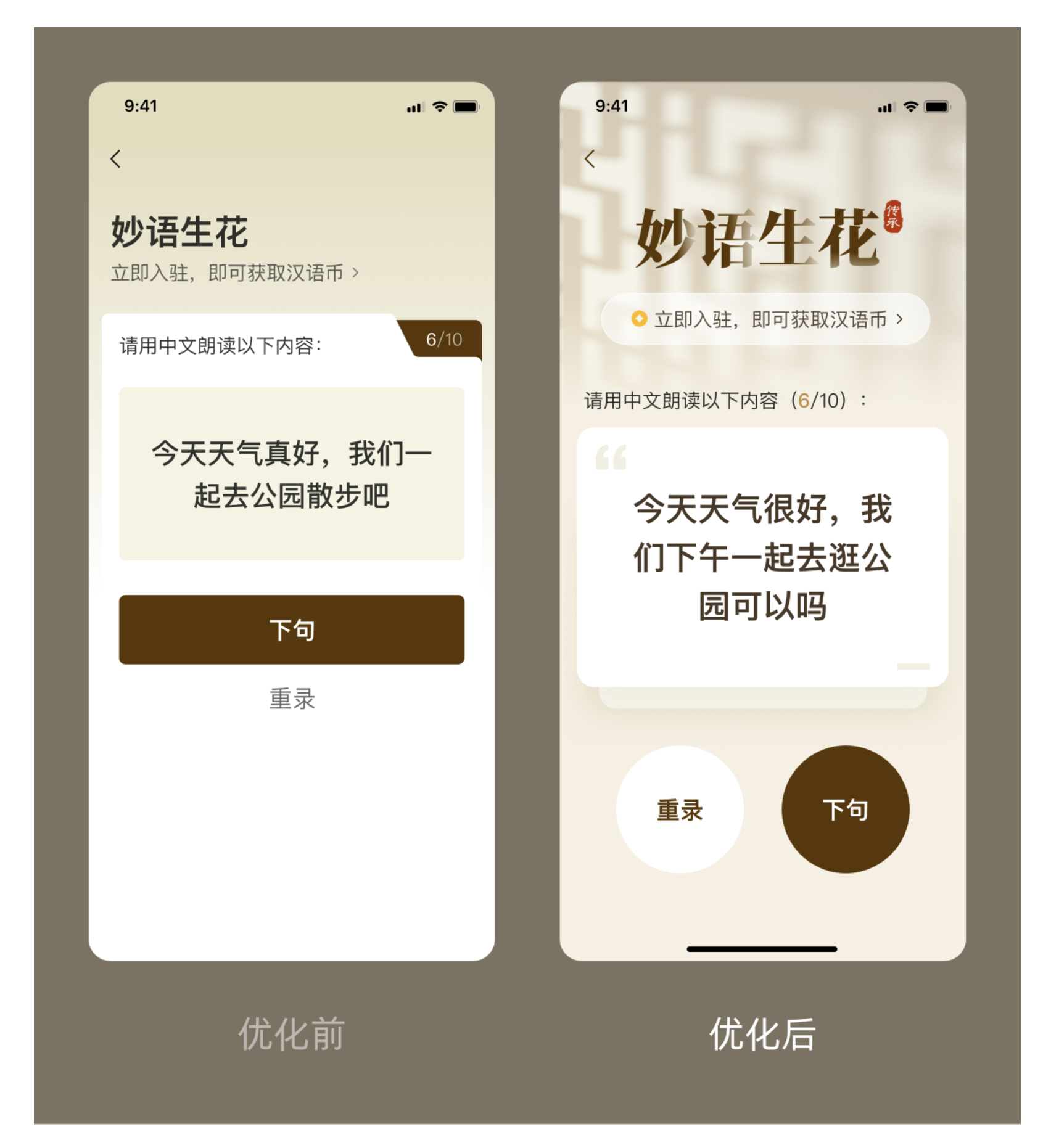 其實很多看似無從優化的常規界面,只是沒找對發力點。那些讓人眼前一亮的設計,往往不是靠復雜的元素堆砌,而是在細節處做巧思。下面就以一個語音跟讀類界面為例,放上優化前后的完整對比,再一步步拆解實操技巧,看完你就知道,再普通的界面也能輕松提升質感!