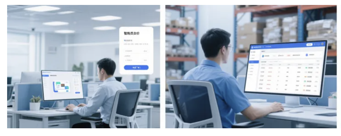 • 針對采購員:核心需求是比價、下單、跟進采購進度,設計重點為打造智能比價工具,自動整合供應商報價信息,提供快速下單入口,同時實時展示采購單的審批、發貨、到貨狀態,讓采購流程可視化。