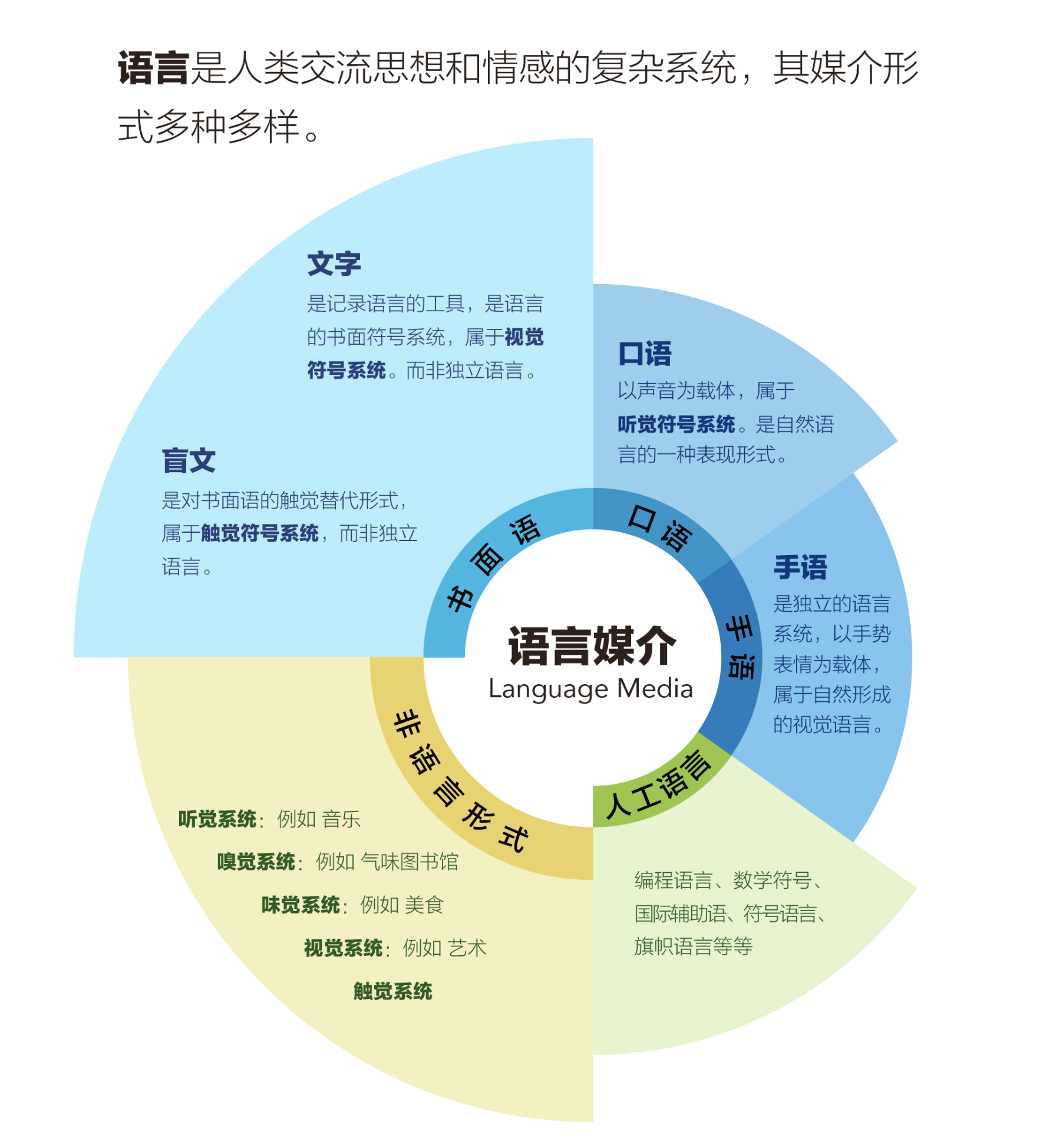 - 自然語言:依托人類自然交流形成,是最基礎的語言媒介,包含口語、手語、書面語三大類。其中口語以聲音為載體,屬于聽覺符號系統;手語以手勢、表情為載體,是獨立的視覺語言系統;書面語則包含文字與盲文,文字是記錄語言的視覺符號工具,盲文則是書面語的觸覺替代形式,歸屬于觸覺符號系統。