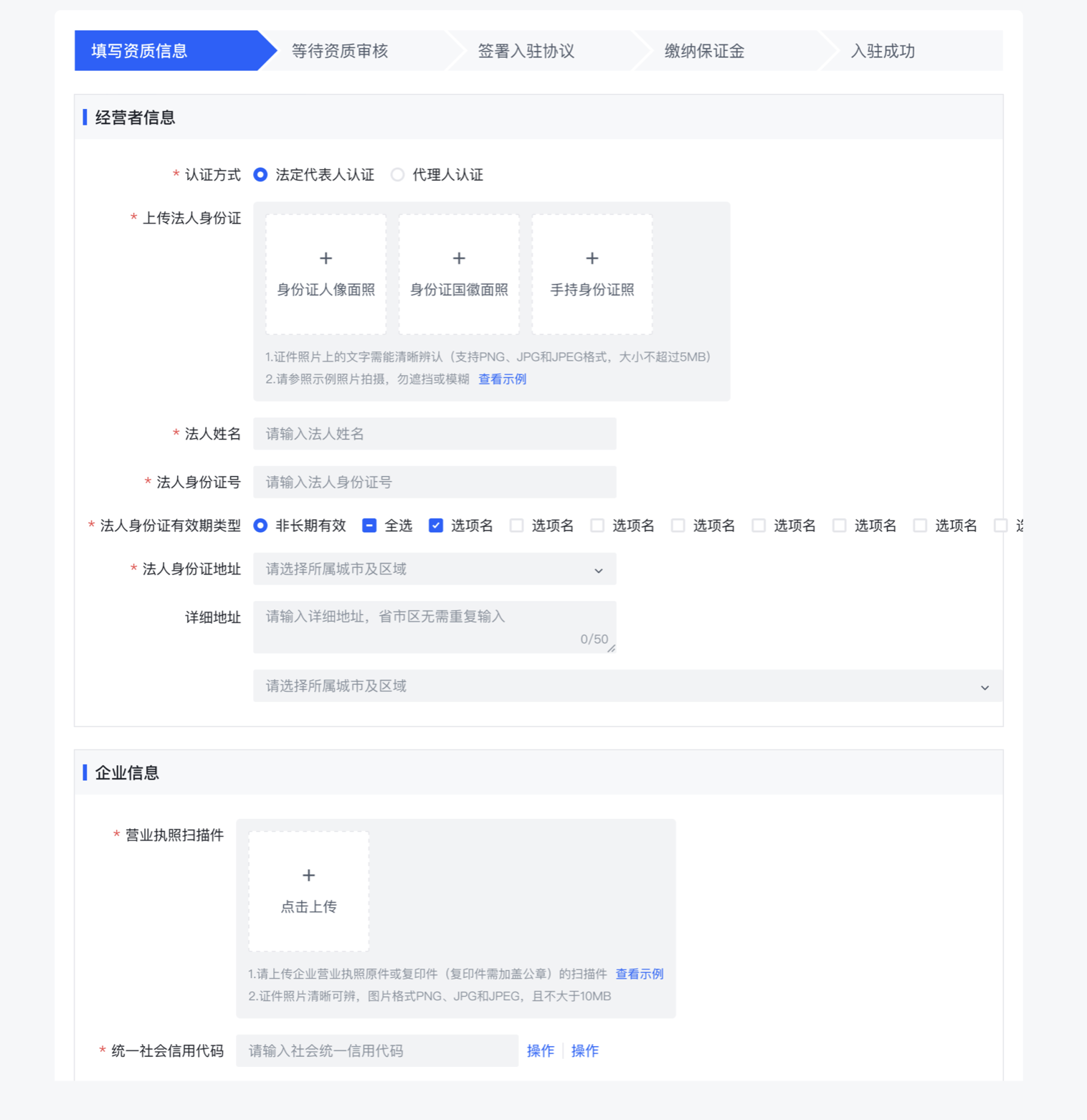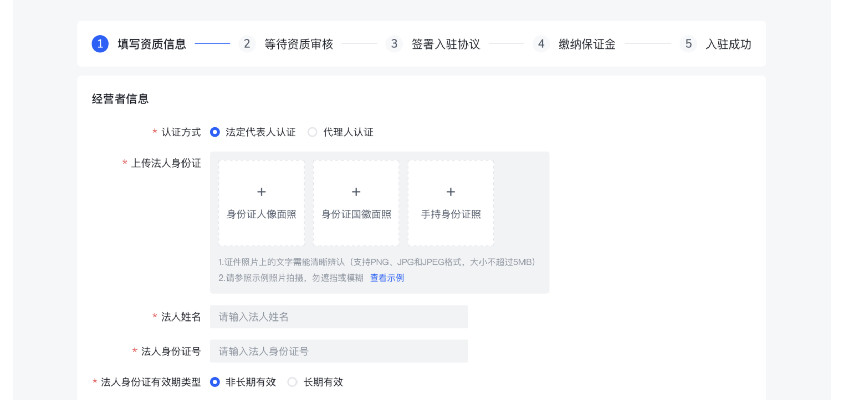 例:商家入駐平臺時,第一步選擇 “入駐類型(企業 / 個人)”,第二步會根據選擇分別展示 “營業執照上傳” 或 “身份證上傳” 的表單內容,前后步驟強關聯,線性流程能讓用戶的操作更清晰,避免無效信息的干擾。