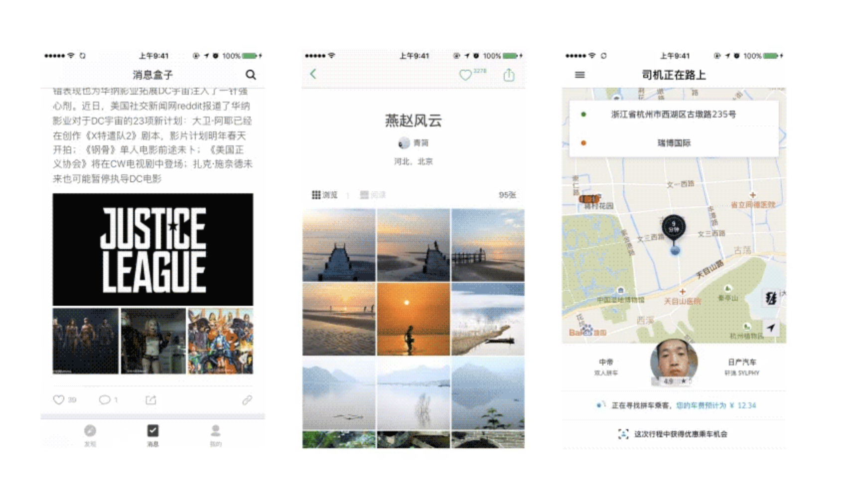 即刻 APP 中,點擊無鏈接的內(nèi)容時,內(nèi)容會自然左右晃動,同時頂部彈出提示文案,反饋自然且無視覺干擾;豆瓣的大圖查看功能,按住圖片移動可顯示背景并自由滑動,松開即返回小圖模式,交互邏輯貼合用戶操作習(xí)慣;Uber 點擊查看司機(jī)信息時,地點信息自動隱藏,司機(jī)照片與車輛信息分開展示,查看完畢后自動收回,既提升了界面的使用效率,又讓動畫過渡流暢自然,這些都是微交互設(shè)計的優(yōu)秀實踐。