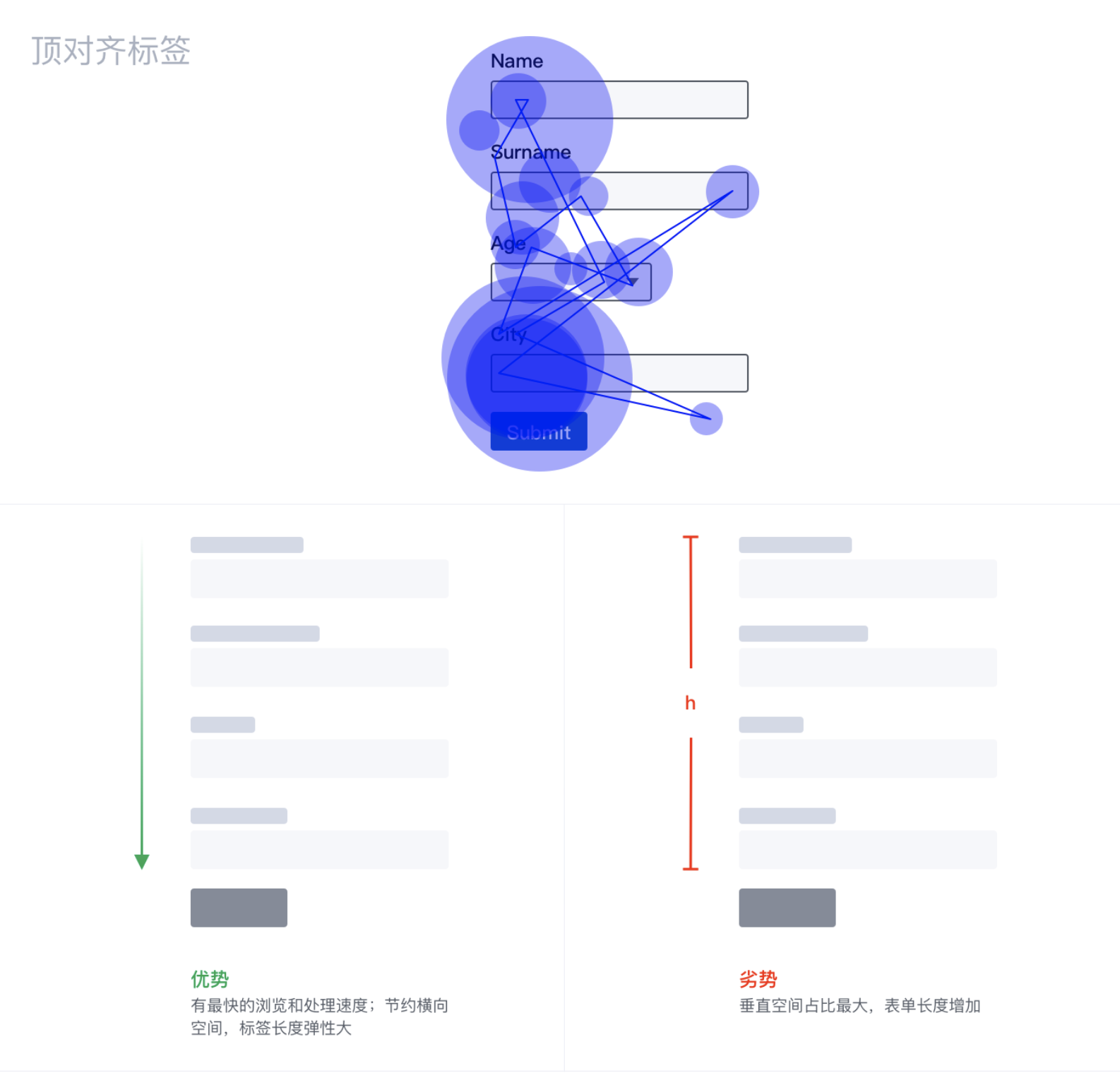 眼動研究數據顯示,頂對齊標簽的眼動時間僅為 50 毫秒,是左對齊的 1/10、右對齊的 1/4.8,用戶視線只需在標簽與輸入框之間做