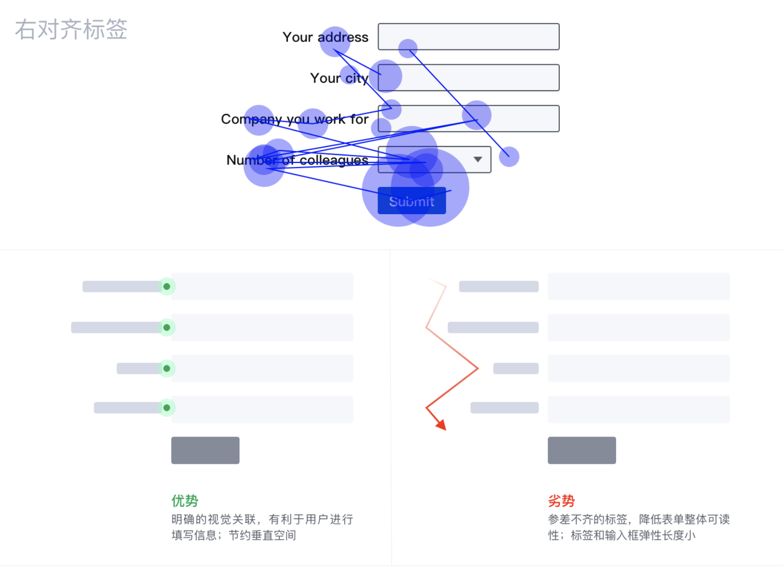 右對齊標簽的眼動時間為 240 毫秒,填寫速度比左對齊快 2 倍,標簽與輸入框緊密相鄰,兼顧了填寫效率與空間利用率。