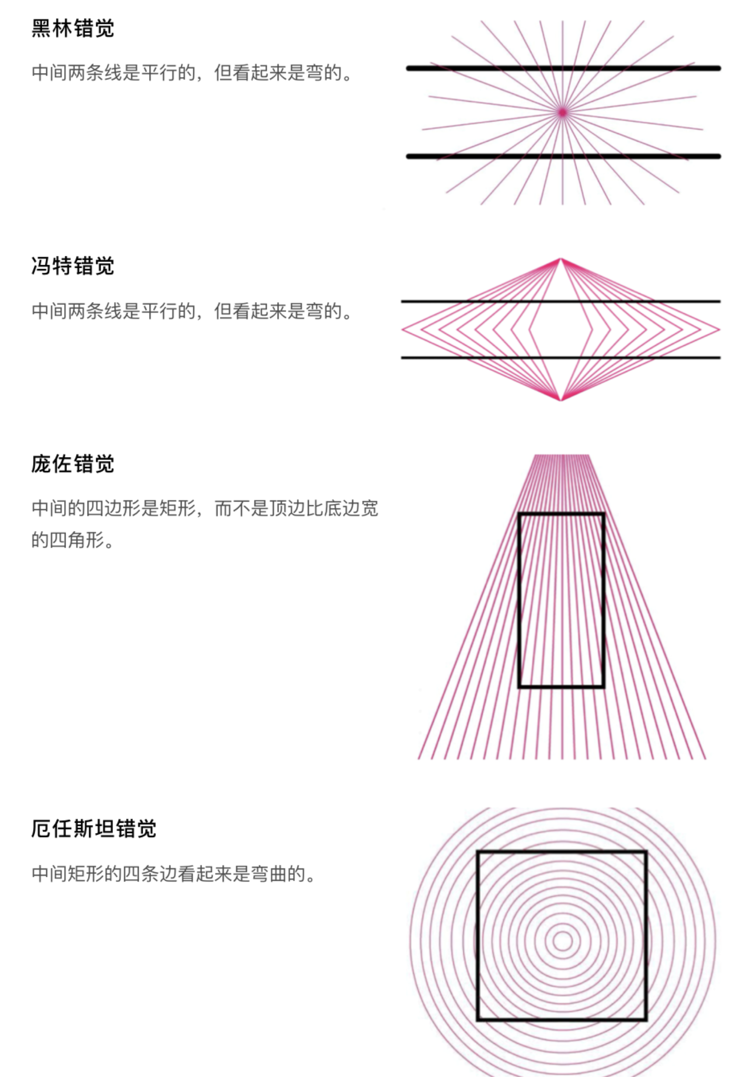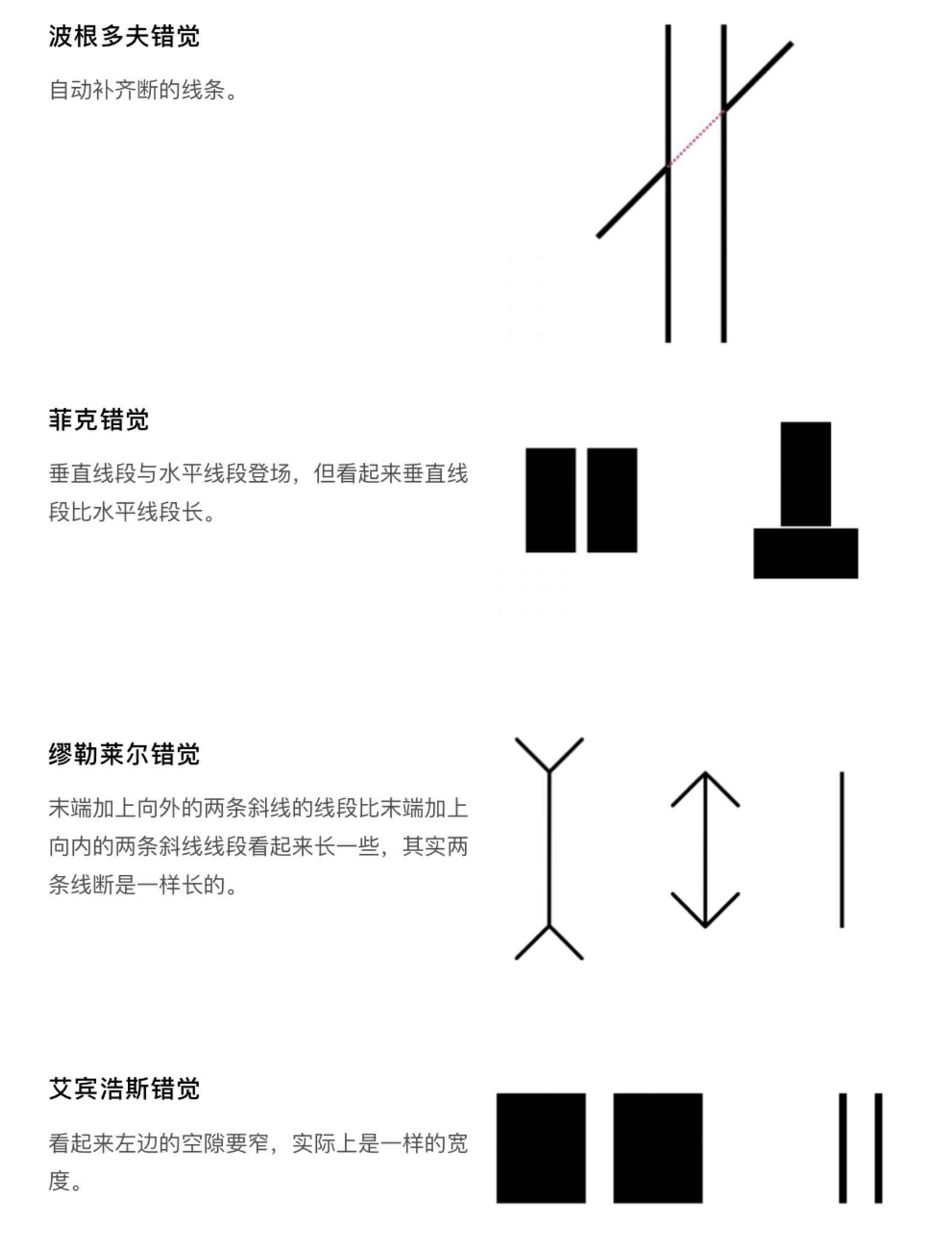 1. 幾何感知錯覺:黑林錯覺、馮特錯覺中平行線條看似彎曲,龐佐錯覺中矩形看似頂寬底窄,厄任斯坦錯覺中矩形邊框看似彎曲,這些錯覺提醒我們,在設計直線型界面元素(如邊框、分割線、按鈕)時,需通過適度的視覺調整抵消錯覺影響,保證界面規整性;菲克錯覺、垂直水平錯覺中,等長的垂直線段比水平線段視覺上更長,繆勒萊爾錯覺中末端斜線朝向影響線段長度感知,這一規律常被用于按鈕、輸入框的尺寸設計,讓界面元素在視覺上達到平衡。