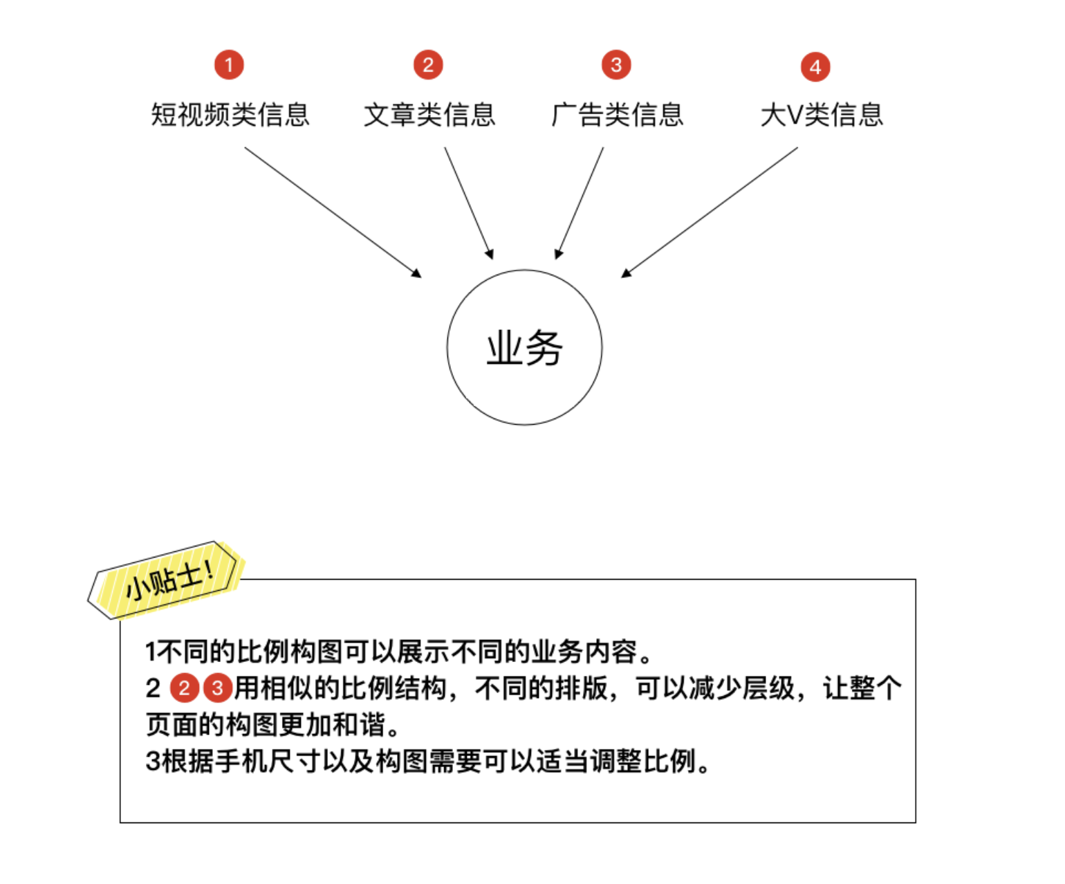 按業(yè)務(wù)維度適配比例,一屏頁面中可根據(jù)不同業(yè)務(wù)線的信息屬性,搭配多種近似黃金分割比,比如短視頻類信息用 1:1、文章類信息用 2:3、廣告類信息用 5:8,用差異化比例區(qū)分信息層級(jí),讓構(gòu)圖和諧且有層次;二是