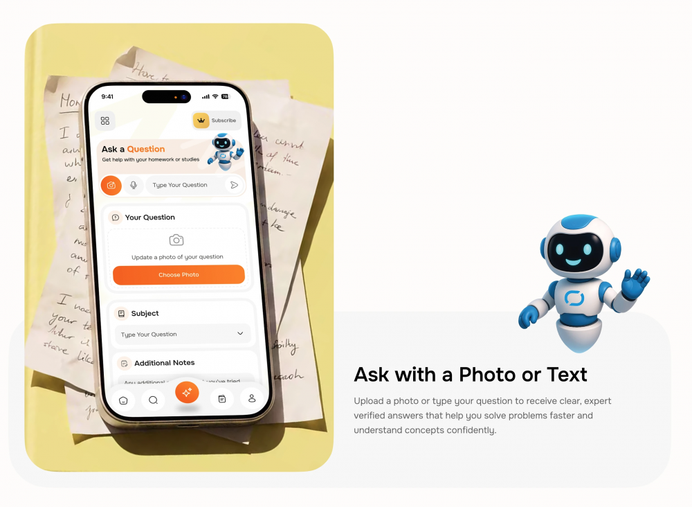色彩體系以柔和暖橙搭配干凈白色為主,局部點綴低飽和亮色區(qū)分學科與功能模塊,視覺上清新治愈,有效緩解長時間使用的視覺疲勞。界面布局遵循移動端通用交互習慣,底部固定核心導航欄,首頁核心功能入口直觀展示,提問、搜題、文庫、個人中心等高頻功能一鍵可達,操作路徑極簡,新手也能快速上手。