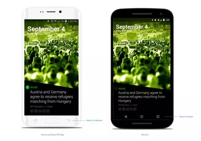 典型的安卓設(shè)備在屏幕上有特定的Home, 返回和菜單按鍵。然而,三星是以實(shí)體按鍵的形式應(yīng)用在他們的硬件設(shè)備上的。這讓一切又變得些許不同。確保你的排版能在三星和其它設(shè)備上都說(shuō)得通。