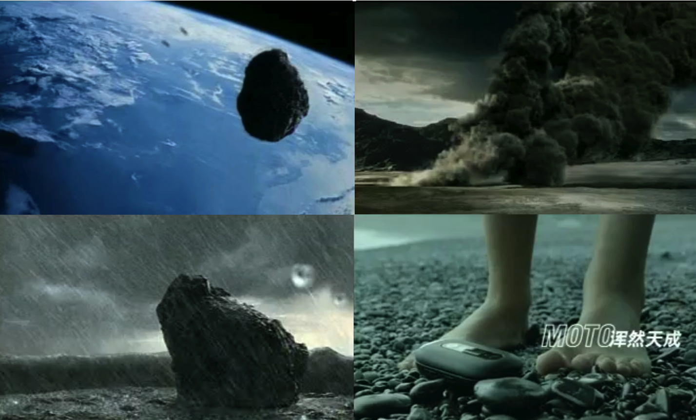 想到這里,我記得個人非常喜歡MOTO的一款手機U6,它的廣告也同樣精彩:一塊太空隕石轟然墜落大氣層,歷經風吹日曬、雨雪凌虐,在歲月洗禮中,滄海桑田,最后成為沙灘上一顆圓滑的黑色鵝卵石,一個美女撿起打開,聲音響起:Hello Moto!