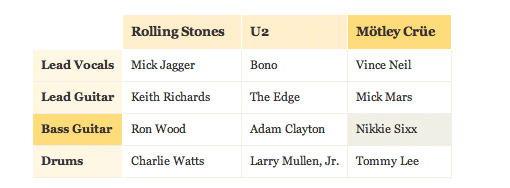 一如以往,我們從最明顯的地方開(kāi)始。第一步是決定表格的整體結(jié)構(gòu)。結(jié)構(gòu)取決于呈現(xiàn)數(shù)據(jù)的類型和復(fù)雜性。選擇 垂直的列還是水平行,通常取決于個(gè)人偏好。大致規(guī)劃下表單的內(nèi)容,然后決定采取哪種方法能更好地傳遞信息。很顯然,如果信息包含多變量,那么選擇矩陣來(lái)表示。下面分別以幾個(gè)簡(jiǎn)單案例來(lái)開(kāi)始。