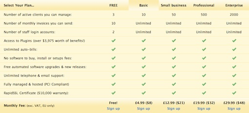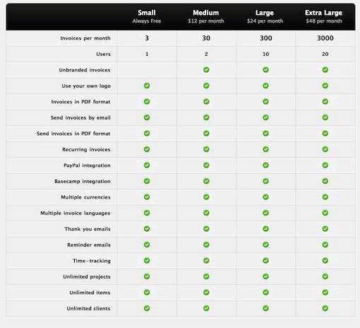 看一下Invoice Machine的例子,表格里除了最上面的三種功能,其他功能的四個(gè)條目項(xiàng)都一樣。該表格因此增加了沒(méi)有必要的15行。解決方法可以通過(guò)一個(gè)簡(jiǎn)單的公告列表說(shuō)明“我們的計(jì)劃都包括以下功能”,用戶能夠快速看到,他們無(wú)論選擇哪個(gè)計(jì)劃,都會(huì)具備這些功能。表格只需要縮短成3-4行,用來(lái)顯示不同的部分。我再次重申,表格應(yīng)該讓信息更易讀。如果您的表格不符合這一目標(biāo)則會(huì)適得其反。