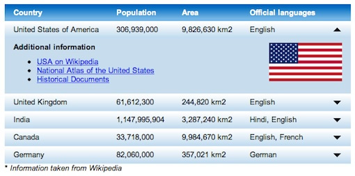 另外一個(gè)功能是給表格的特定行增加展開(kāi)功能。可以把大量?jī)?nèi)容放置到一個(gè)相對(duì)整齊的空間。一個(gè)簡(jiǎn)單的jQuery小 插件jExpand可以實(shí)現(xiàn)這個(gè)功能。具體實(shí)現(xiàn)可以查看 tutorial from jankoatwarpspeed