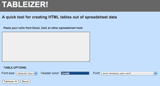 我偶然發(fā)現(xiàn)了一個(gè)小的web應(yīng)用程序:Tableizer ,它可以把Excel里的表格粘貼進(jìn)來(lái)轉(zhuǎn)換成HTML。利用這種方式你仍然需要自己寫(xiě)一些樣式,但是會(huì)節(jié)省前期的表格構(gòu)建時(shí)間。