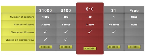 這里是“Ask The CSS Guy”里的另一個(gè)例子,允許用戶選擇表格的給定列(價(jià)格表),當(dāng)前選擇會(huì)高亮突出顯示,并且能展開(kāi)顯示更多信息。這種方式和上一個(gè)例子是一致的,但是有不同的效果。查看demo 具體實(shí)現(xiàn)請(qǐng)點(diǎn)擊: