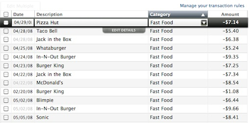 如果表格信息很多,分成幾列,可以對(duì)列進(jìn)行排序,用戶可以選擇按他們希望的方式瀏覽。 Mint.com 對(duì)交易列表進(jìn)行了排序,用戶可以很容易地從按日期瀏覽切換到按種類瀏覽,從而能比較出哪一塊你愿意花很多錢(qián)。如上截圖所示,顯然我更喜歡吃油膩的快餐。