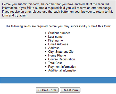 Not clearly distinguishing between primary and secondary actions can easily lead to failure. The above action buttons are found at the end of a lengthy form for enrolling in St. Louis Community College. Just imagine pressing the “Reset Form” button by accident.