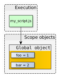在上面的代碼中,我們有一個執行的上下文(myscript.js自身的代碼),以及它所引用的作用域對象。全局對象里面還含有很多不同的屬性,在這里我們就忽略掉了。