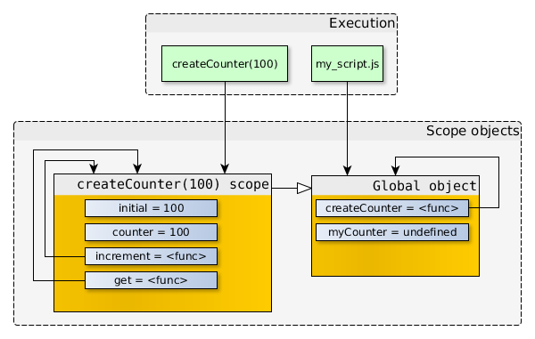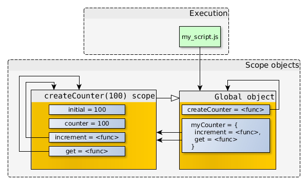 注意increment和get函數都存有指向createCounter(100) scope的引用。如果createCounter(100)沒有任何返回值,那么createCounter(100) scope不再被引用,于是就可以被垃圾回收。但是因為createCounter(100)實際上是有返回值的,并且返回值被存儲在了myCounter中,所以對象之間的引用關系變成了如下圖所示