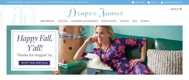 看看 Draper James 的服裝網站吧。首頁大圖中最吸引人的大概是妹子臉上的微笑吧?明亮的色彩給用戶愉悅的體驗,而隨后的文案內容“Happy Fall,Y’all”它將秋季的愉悅情緒毫不掩飾地表露出來,用戶在這個時候可以直接地體會到設計師的情感。當然,這樣的設計針對性很明顯,有一部分用戶可能會因此離開,但是你需要針對這個進行判斷。