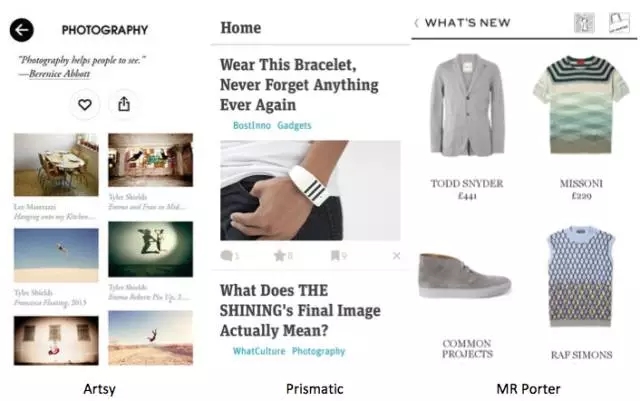 Artsy的圖片瀑布流,完全沒有用到線和面來區(qū)分信息組塊,而就是用內(nèi)容本身做排版,用戶可以更加集中注意力于圖片內(nèi)容上。Prismatic利用字體排版,盡可能的內(nèi)容前置,弱化圖標和操作,讓用戶更集中注意力于內(nèi)容閱讀上。而MR Porter則利用商品圖片、名稱和價格直接做設計,讓用戶聚焦于商品本身。