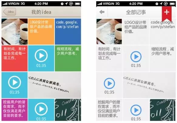 可是對于一些內(nèi)容型的APP,也許并不適用,比如GoogleKeep的多彩卡片,確實是在內(nèi)容閱讀上會起到反效果。百度云記事本第一版設計也是多彩色的,但是后來考慮到文字記事比較多,為提供良好的文字閱讀體驗,還是把多彩色改成灰白色微質(zhì)感的設計。