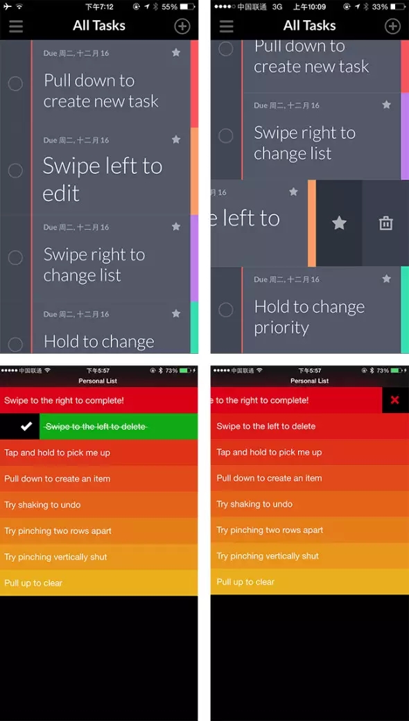 Taasky和Clear作為兩款交互優(yōu)秀的任務(wù)應(yīng)用,都擁有非常豐富手勢(shì)操作,它們沒有像別的軟件一樣在界面上加遮罩、標(biāo)注做出冗長的用戶教育頁,而是直接將操作指引嵌在一條條的任務(wù)里,用戶只要跟著當(dāng)前任務(wù)的簡(jiǎn)單描述滑動(dòng)屏幕就能了解全部手勢(shì)操作,即充實(shí)了原本空白的缺省頁面又很自然地指導(dǎo)用戶如何使用該軟件。