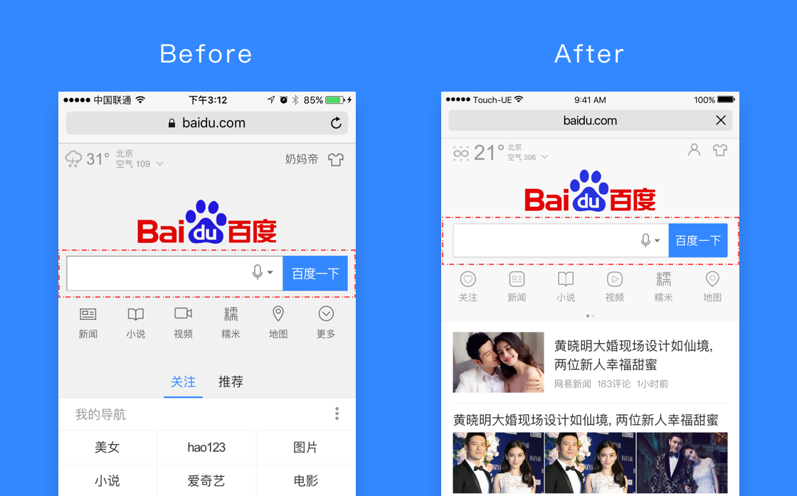 百度三端首頁每天數億人使用,作為設計團隊我們經過不斷實踐和反思,提煉整合確立了自己的設計觀,通過以下一些案例分享其中一些經驗,希望以此作為設計師工作思考的模板與參考。