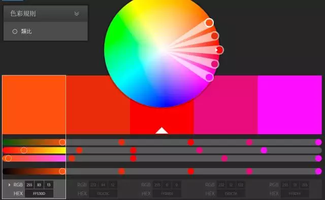 adobe這個是Adobe公司出的,他提供了多種配色方案。我們點擊圓盤中間的點,就可以調整出我們想要的配色方案:https://color.adobe.com/zh/create/color-wheel