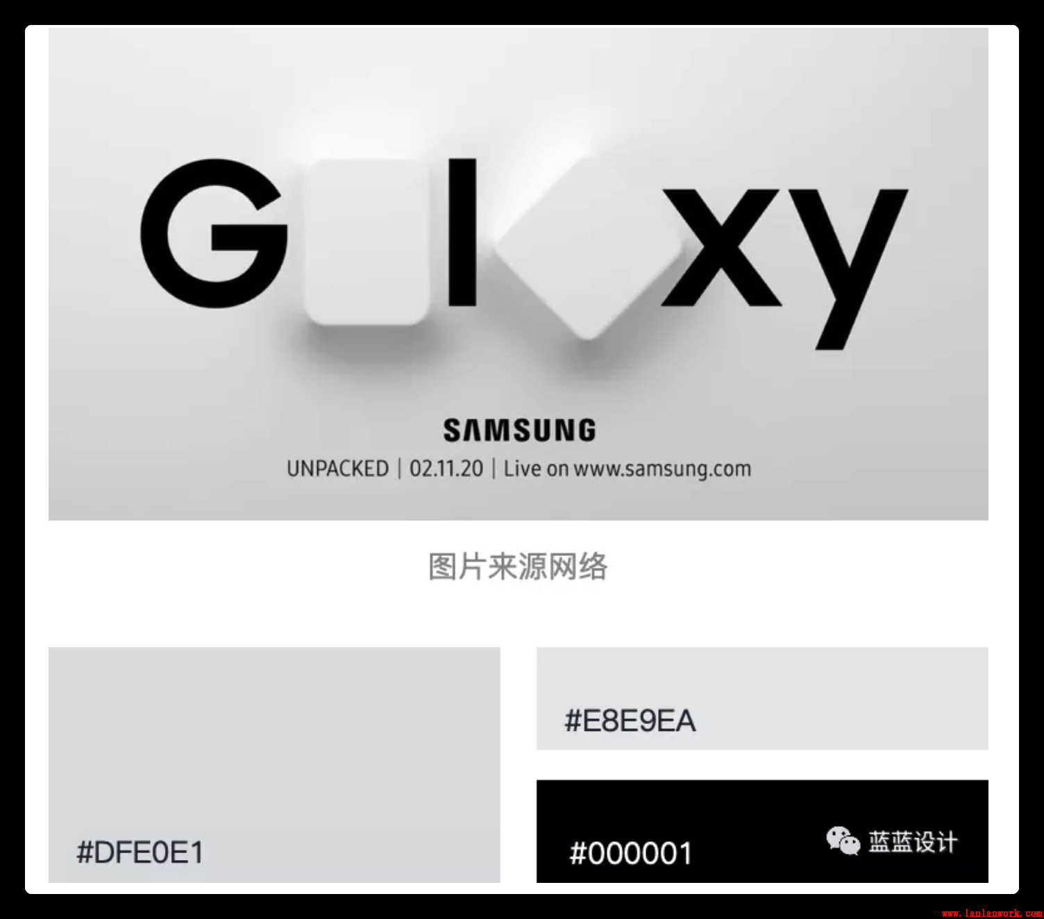 在2020年2月11號舉行的三星視覺發布會使用新擬態的設計手法作為設計海報。帶有漸變的淺灰色背景,結合富有層次感的光影漸變,充滿未來感。相對克制的色彩選擇和多角度的光影變化,強調出產品豐富的質感和科技感,簡潔而神秘。