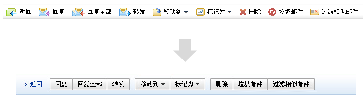 上面的是我們外貿郵界面目前的狀態,所有的操作都并列擺放,隨著功能的增多,用戶識別的效率大大降低,優化的方案是將相關的操作進行分組,正是運用關聯和并列的信息關系進行設計
