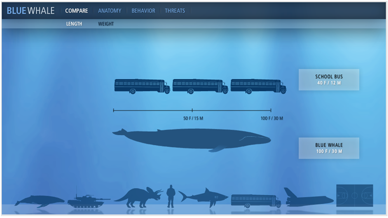 舉個例子:國家地理藍鯨網站 為了呼吁保護藍鯨,首先要讓人們了解藍鯨的特征及當前的威脅,網站通過動態的將藍鯨與其他生物和人造物進行對比,形象直觀的傳達藍鯨的重量、大小,加上視頻展示目前藍鯨的主要生活威脅,用戶即使不閱讀文字也能大致明白網站想要傳達的信息