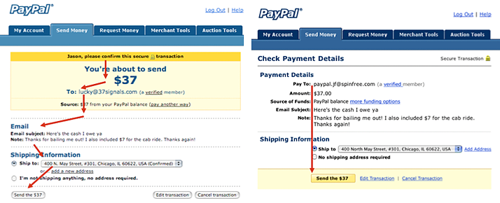 下圖是PayPal支付頁面的一次優化過程,老版視覺雖然有層級區別,卻打亂了完成任務的視線順序,優化后強調行動點,行動前的視覺順序在同一方向上,順序的關系很明顯,能提升用戶的任務完成率。