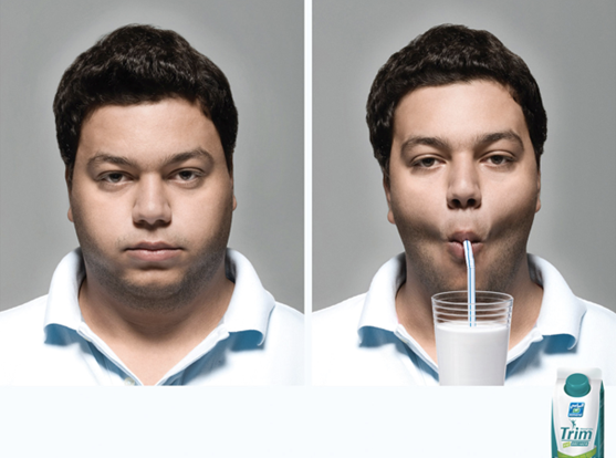 上圖是一個減肥飲料的廣告,通過前后人物的變化,輕松的表達產品的功效,而在我們網頁界面中,主要還是通過色彩的對比和方向指向來傳達順序關系
