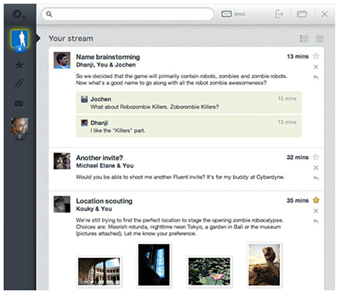 Fluent新型電子郵件界面,箭頭指向、縮進的表現形式很清晰的表達信息的包含關系,雖然這個創業團隊沒有成功,但產品的設計還是很值得借鑒的