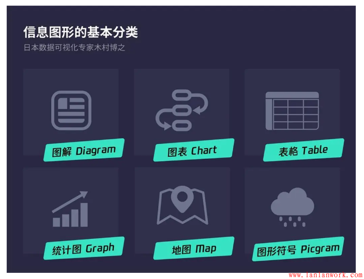 根據(jù)木村博之的定義,從視覺表現(xiàn)形式的角度,將「信息圖表」的呈現(xiàn)方式分為六大類:圖解(Diagram)、圖表(Chart)、表格(Table)、統(tǒng)計圖(Graph)、地圖(Map)、圖形符號(Pictogram)。